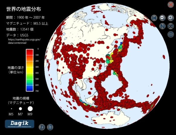 世界の地震分布( 出典:DagicEarthダジック・アース)- 地震計と慣性の法則 - Javalab